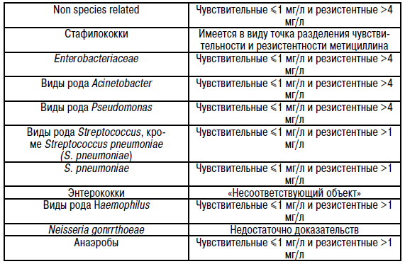 Чувствительность микроорганизмов. Распространенность приобретенной резистентности отдельных видов может варьировать в разных географических регионах, и поэтому очень полезна информация о структуре местной резистентности, особенно при лечении пациентов с тяжелыми инфекциями. В случае необходимости следует обращаться к специалисту, если структура местной резистентности такова, что применение данного препарата, по крайней мере при некоторых типах инфекции, вызывает сомнения.