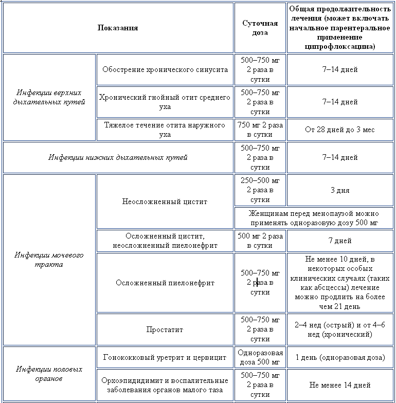 Выведение. Ципрофлоксацин выделяется преимущественно в неизмененном виде как почками, так и через кишечник. T½ из плазмы крови у лиц с нормальной функцией почек — около 4–7 ч.