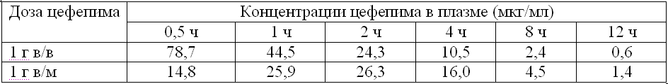 Средние концентрации цефепима в плазме крови у взрослых здоровых мужчин через разное время после однократного в/в или в/м введения приведены в табл. 1.